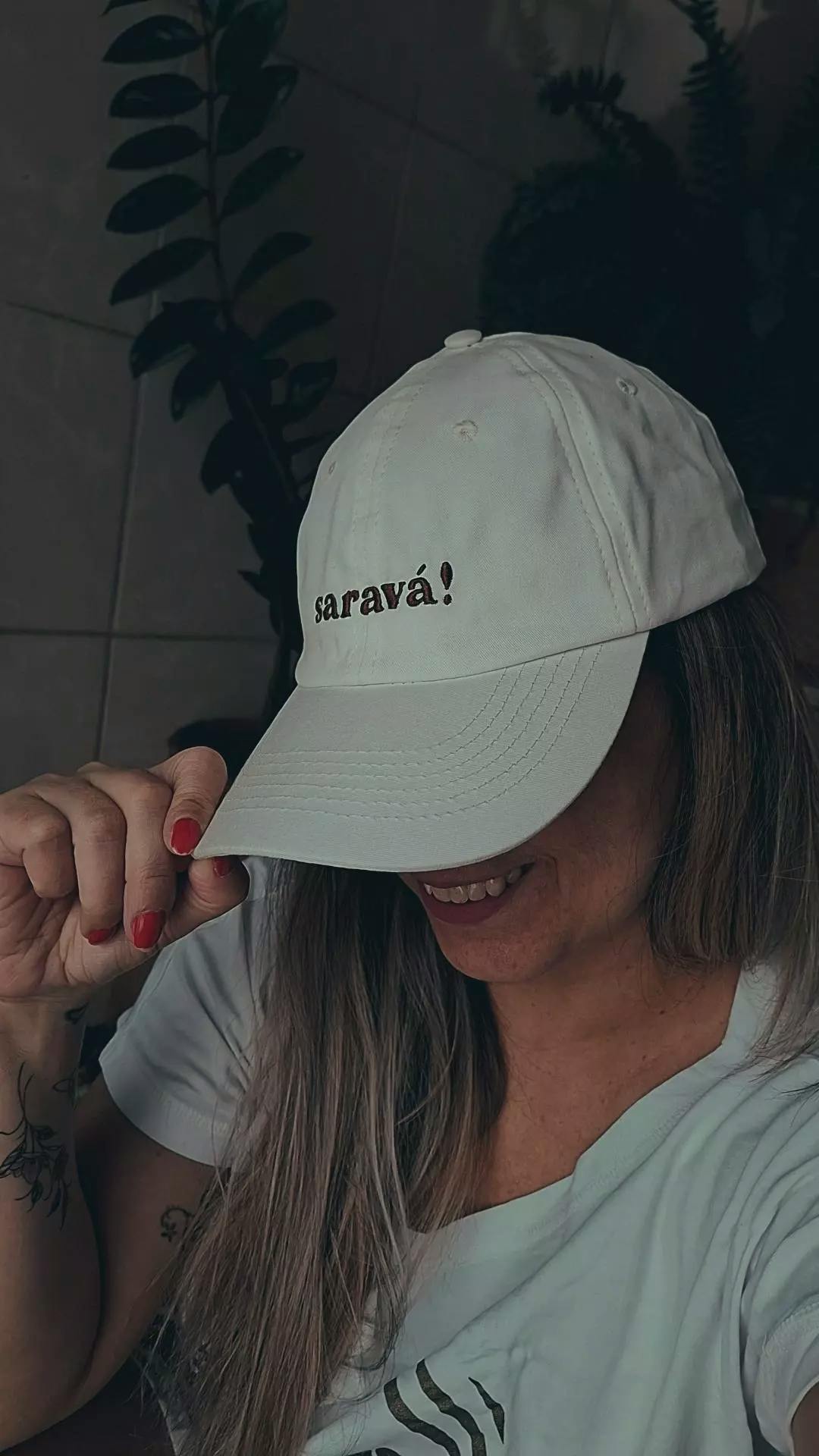 Clareza no olhar e axé na cabeça. O boné branco com a palavra SARAVÁ em marrom carrega a força da saudação que abre caminhos, celebra a fé e honra os guias espirituais. Um acessório que é símbolo de paz, conexão e respeito às tradições.